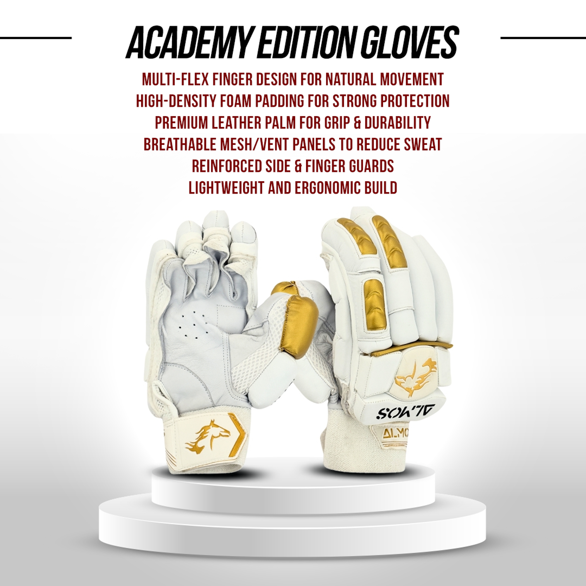 Crafted with premium PU materials, leather palms, and ergonomic design, the Academy Edition cricket batting gloves combine lightweight feel with maximum durability. Multi-flex construction allows natural hand movement, while high-density foam padding absorbs shock from powerful deliveries. A textured leather palm ensures a secure, non-slip grip, and mesh ventilation keeps your hands cool and sweat-free even in extended sessions.