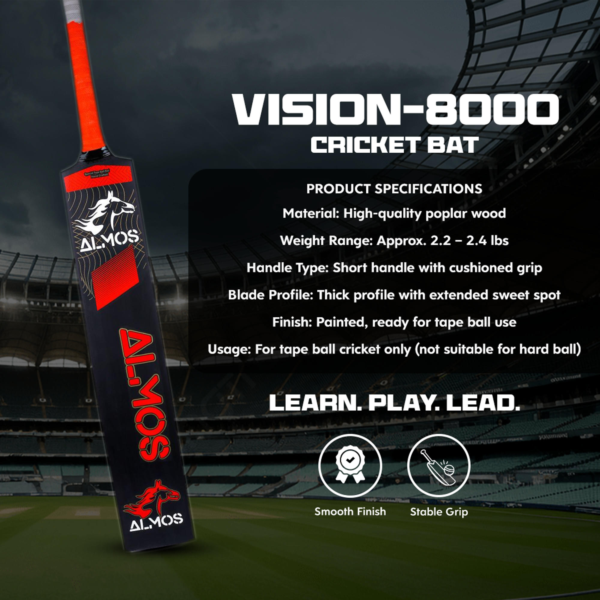 Step up your street cricket game with the Almos Vision 8000 Tape Ball Cricket Bats, built for players who want lightweight power, precision, and style. Featuring a bold painted finish, this bat is designed to help you dominate in street matches, tournaments, and practice sessions.